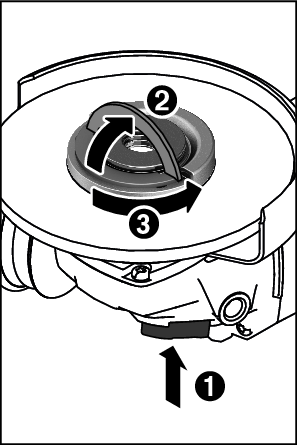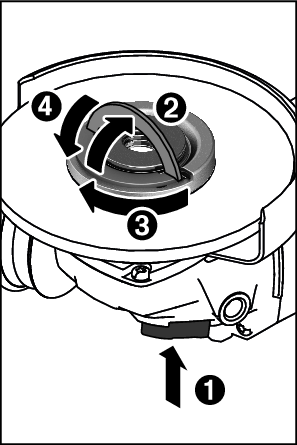 Press the spindle lock button (2) to lock the grinding spindle. To tighten the quick-clamping nut (21), fold up the bar and turn the quick-clamping nut firmly clockwise. Then fold down the bar to secure the quick-clamping nut. It is not sufficient to tighten the disc along the edge.