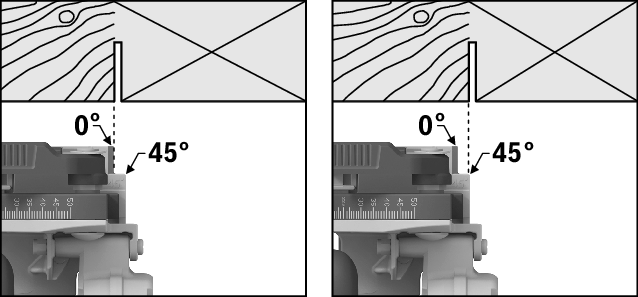 The 0° cut mark (13) indicates the position of the saw blade when making a right-angled cut. The 45° cut mark (12) indicates the position of the saw blade when making a 45° cut.