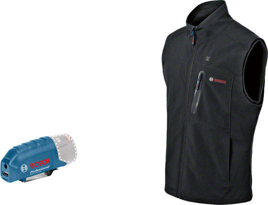 The jacket’s heating pads are powered by the GAA 12V-21 charging adapter (included) and 12 V battery from Bosch or, optionally, by the GAA 18V-48 charging adapter and 18 V battery from Bosch (not included).